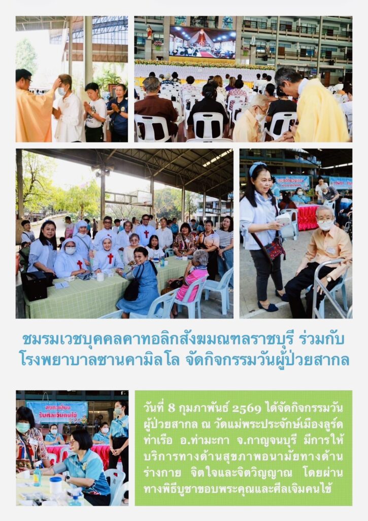 วันที่ 8 กุมภาพันธ์ 2569 ชมรมเวชบุคคลคาทอลิกสังฆมณฑลราชบุรี ร่วมกับโรงพยาบาลซานคามิลโล จัดกิจกรรมวันผู้ป่วยสากล ณ วัดแม่พระประจักษ์เมืองลูร์ดท่าเรือ อ.ท่ามะกา จ.กาญจนบุรี บริการด้านร่างกาย ได้ให้บริการด้านสุขภาพอนามัย ตลอดจนในด้านจิตใจและจิตวิญญาณ ผ่านทางพิธีบูชาขอบพระคุณและศีลเจิมคนไข้